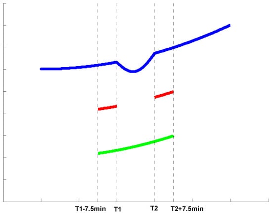 Diagram for the partial fitting strategy. The blue line shows the synthesized TEC time series including EPB signals during the period of (T1, T2). The red line shows the data for fitting. The green line shows the fitted TEC time series.