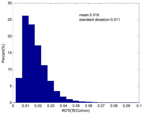 Table 1 lists the corresponding parameters of the EPBs detection method in this study. The minimums of depth and duration are set to 4 TECU and 10 min, respectively. According to the experimental results, the value of up ROTI could be set to 0.1–0.3 TECU/min (0.2 TECU/min here). The value of down ROTI is very important as it is related to the duration. Figure 2 presents the percent distribution of the ROTI values calculated for station HKKT during 2014. Considering that EPB generally occurs at night, only ROTI values from 6:00–18:00 LT are counted. As shown in Figure 2, the vast majority of the ROTI values are smaller than 0.04 TECU/min. Here, the value of down ROTI is set to 0.04 TECU/min. Furthermore, to distinguish from other events which lead not only to TEC depletion but also TEC enhancement (such as MSTIDs), the maximum of detrended TEC should be less than one-third of the depth.