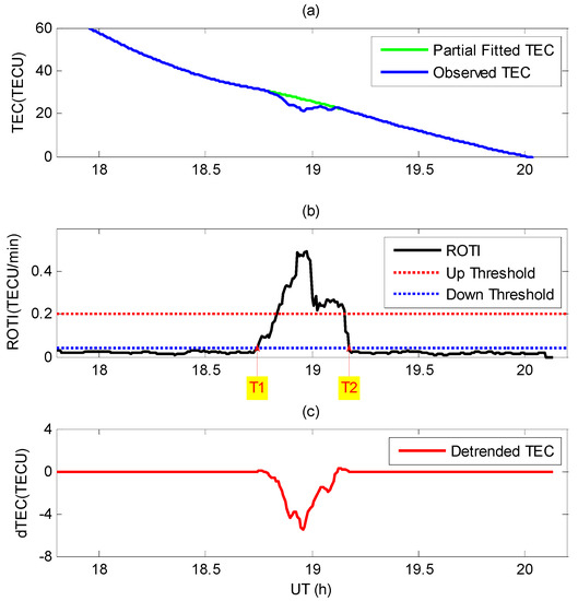 The ROTI series are then employed to seek the occurrence time of EPBs. Two thresholds, namely “up threshold” and “down threshold”, are adopted. For a period of TEC series , if the ROTI values are larger than the down threshold and the maximum values are larger than the up threshold, then this period could have an EPB event. Then, we use the low-order polynomial (third order in this case) to fit the TEC data during and . That is to say, the TEC data during the event are not used (see Figure 1). We call this strategy the partial fitting, as opposed to the general fitting method. Lastly, the detrended ionospheric TEC series, including possible EPB signals, are extracted by subtracting the fitted TEC series from the observed TEC series. If the TEC depletion maximum (called “depth”) and duration of the EPB candidate meet the defined thresholds then it can be confirmed as an EPB event or vice versa.