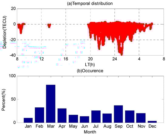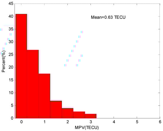 Figure 4 presents the temporal distribution of the EPBs (top panel) and the percent distribution of EPBs occurrence (bottom panel) detected by the station HKKT, during 2014. As shown in Figure 4a, EPBs generally occur after 20:00 local time and are observed throughout the nighttime. As shown in Figure 4b, the occurrence of EPBs during the spring and autumn equinoxes is significantly greater than their occurrence during the summer and winter solstices. The observed temporal distribution and occurrence of EPBs over the Hong Kong area are also reported in previous studies [,], suggesting that the detection method is feasible. As shown in Figure 4a, part of the values of the depletion series is positive. Theoretically, the values of the depletion series should be negative. So, the maximum positive value (MPV) of each depletion series can serve as a reference index to assess the accuracy of the detection result. Figure 5 presents the percent distribution of the MPV by the station HKKT during 2014. As shown in Figure 5, most of the MPVs are smaller than 1.5 TECU. The mean value of the MPV is 0.63 TECU.