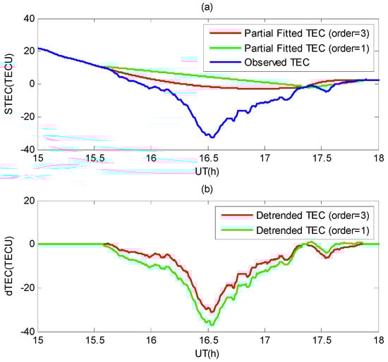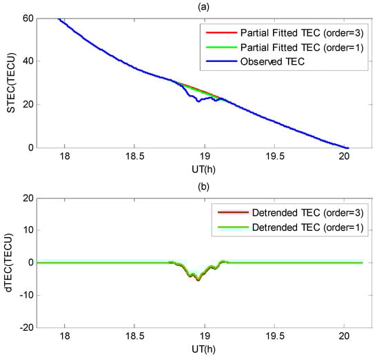 Same example in Figure 3 with first-order and third-order partial polynomial fitting. (a) Observed total electron content (TEC, blue line) and partially fitted TEC using first-order (green line) and third-order polynomial (red line); (b) detrended TEC by subtracting between the observed and partially fitted TEC (green line for first order and red line for third order).