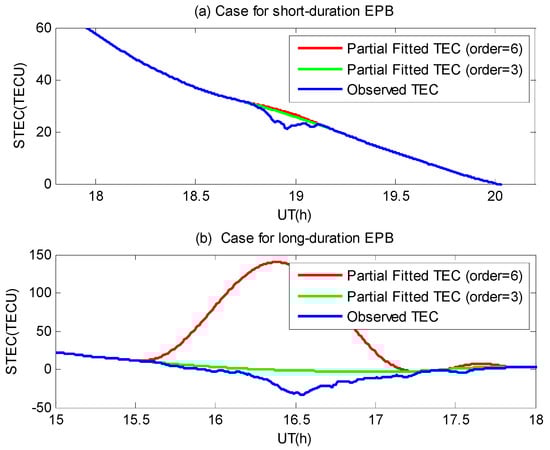 It is worth noting that the magnitude of the polynomial order for the ROTI-aided method should not be too high, as in the case of the sixth order. For the EPB with a long duration, the partially fitted TEC may be unreliable with a high-order polynomial. Figure 8 presents the above two cases with a third-order and a sixth-order partial polynomial fitting strategy, respectively. As shown in the figure, for short-duration EPB, both third-order and sixth-order partial polynomial fitting results are suitable. However, for a long-duration EPB, the sixth-order partial polynomial fitting result is not reliable.