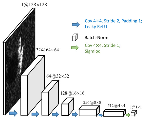 The discriminator D: The detailed network architecture of the discriminator D is shown in Figure 3. Its input is the adversarial example or original SAR image x with the size of . There are five blocks in the discriminator, each of which contains a convolutional layer with the stride size of 2 and padding size of 1 followed by a batch-normalization layer. The activation function between each block is a leaky ReLU function. The output layer is a sigmoid layer and outputs a scalar indicating whether the input sample is an original SAR image.