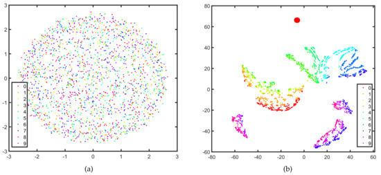 The separability of the original SAR images and features extracted by the generator (UNet) of Attack-UNet-GAN. The SAR images and the features are mapped to the two-dimensional subspace by T-SNE shown as the dots on the plane. Each dot represents a SAR image or the feature of a SAR image, and each color denotes a category. (a) the original SAR images, (b) the features extracted by the UNet.