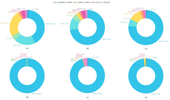The misclassified category distributions of adversarial attack algorithms are shown in Figure 11 and Figure 12. The ground truth category of all adversarial examples is D7 (bulldozer). Figure 11 shows the misclassified category distributions of the adversarial examples generated by six different attack algorithms for the same SAR-ATR model based on ReNet32. Figure 12 shows the misclassified category distributions of the adversarial examples generated by the same attack algorithm for three different deep CNN-based recognition models. In the pie charts, a color denotes a misclassified category. The percentage denotes the ratio of the number of the adversarial examples misclassified as the corresponding category to the total number of adversarial examples. In Figure 11 and Figure 12, it can be seen that although the adversarial examples are generated by different adversarial attack algorithms or for different attacked recognition models, their major misclassified categories are almost the same. For example, the BRDM2 (armored personnel carrier) is the major misclassified category of the adversarial examples for the original SAR images of the D7 (bulldozer). The reasons for this phenomenon may be the homogeneity and heterogeneity among categories. As it is found in the work [40] that the misclassified categories of the adversarial examples are more probably to be the categories that are closer to them in the sample’s feature space. Meanwhile, it can be observed that the similarity among the SAR images from different categories can be well reflected by the misclassified category distributions. For example, the armored personnel carrier is the major misclassified category of the adversarial examples from the bulldozer, representing that the armored personnel carrier and bulldozer may possess a strong similarity in the feature space or original SAR image space.
