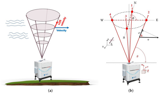 The schematic of Doppler beam swinging scan: (a) visualization of scanning circles at different heights; (b) visualization of the four laser beams configuration of the lidar with relevant angles and two coordinate systems, one used by lidar and one used for wind analysis. For better visibility, just the component of radial velocity in the laser beam 2 direction () and component of wind vector u in the lidar coordinate system are sketched.