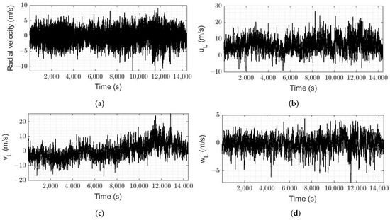 where is the horizontal east–west velocity component, is the horizontal north–south velocity component, is the vertical velocity component and are north-tilted, east-tilted, south-tilted and west-tilted radial wind velocities, respectively. Figure 3 reports an example of time series of radial velocity measured by lidar and wind vector components, retrieved using Equation (1). The elevation angle () of the laser beam was equal to for all measurements. Wind direction (clockwise from north) was calculated as: