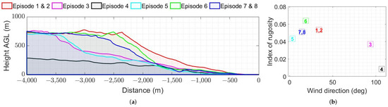 The upstream terrain orography for a 4 km horizontal distance along the prevailing wind direction is reported in Figure 5a for all selected wind episodes. It can be seen that terrain along the prevailing wind direction has the steepest slopes during wind episodes 1, 2, 6, 7 and 8, whereas there are less steep slopes for the wind episodes 3 and 5. The terrain along the prevailing wind direction of episode 4 has the lowest elevations, the smallest slant and is the least abrupt compared to other cases. In order to quantify the complexity of terrain by means of orography, the index of rugosity was used [18,26]. The magnitude of aforementioned index indicates the degree of complexity, i.e., the greater value indicates the more complex terrain. The index of rugosity with respect to prevailing wind direction of selected wind episodes is reported in Figure 5b.