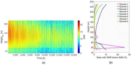 DWL data quality can be quantified in terms of the signal-to-noise ratio (SNR), which is a measure of the relative strength of the backscattered Doppler signal over the inherent background noise. For the lidar used in this study, 6 dB is typically chosen as the lower limit for the accepted uncertainty in the measurements. Lower values of SNR are generally associated with clean air, i.e., the low concentrations of aerosols in the atmosphere [27], which is common during Bora episodes in the Vipava valley. In this study, more than 95% of measured SNR values were found to be above the lower limit (see, for example, Figure 6a). Considering the distribution of data obtained with SNR < 6 dB, reported here in Figure 6b, and considering the possible impact of data obtained with SNR < 6 dB on results and conclusions, we limit the investigation of the flow properties to 8 different heights from 110 to 180 m AGL for Bora episode 1 and to 11 different heights between 80 and 180 m for all other episodes.