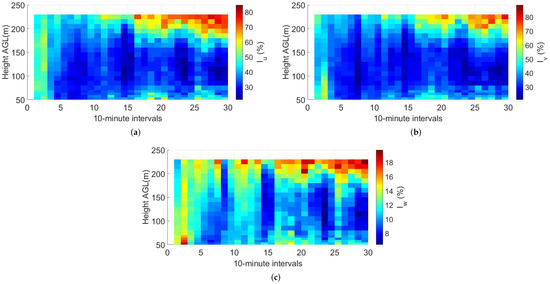 where is the aerodynamic roughness length (or surface roughness) and h is the height above the ground. If we assume that the value of varies between 0.3 m and 0.7 m for the Vipava valley terrain (according to [31,32]), then the along-wind turbulence intensity values would range up to for the heights from 80–180 m AGL according to Equation (4). However, in this study, we have a complex valley environment, as well as a gusty wind, so the deviations from the profile described by Equation (4) are expected and were observed in the analyzed wind episodes. At first glance, we observed large values of turbulence intensity above the Vipava valley during the majority of selected wind episodes. This observation is presented in Figure 7, which reports the time evolution of the turbulence intensity components at all measurement heights, wind episode 5 being taken as the representative example.