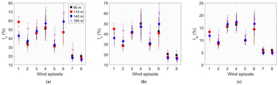 During that particular episode (Figure 7), the turbulence intensity was mainly below 45% at the heights between 80 and 180 m, for both the along-wind and lateral component. The vertical component of the turbulence intensity reached up to a maximum of 17%, with a mean of around 10%. The mean values of the turbulence intensity at 80 m AGL, calculated from all time periods of each selected wind episode, were found to range between 20% and 51% (Figure 8a) for the along-wind component and between 20% and 50% (Figure 8b) for the lateral component, which are both larger than those predicted by the international standard (Equation (4)). The values of the vertical intensity component ranged between 6% and 16% (Figure 8c). A detailed report on turbulence intensity values and their characteristics is given in Table A1 of Appendix B for all eight analyzed episodes and for four different heights AGL. Their mean and standard deviation values are reported in Figure 8.