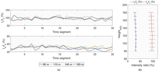 Wind episode 5 on 4.12.2019: (a) time evolution of lateral (top) and vertical (bottom) turbulence intensity as a percentage of the along-wind intensity component at four different heights above the ground. Each time segment represents a 10 min interval; (b) mean vertical profile of the ratio between turbulence intensity components.