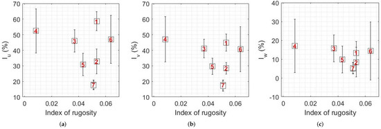 Turbulence intensity at 110 m AGL in the along-wind (a), lateral (b) and vertical (c) direction with regard to index of rugosity for different Bora episodes, labeled by their ordinal number. The index of rugosity represents the orographic complexity of the 4 km path upstream of the measurement site. Note: data points of wind episodes 7 and 8 overlap.