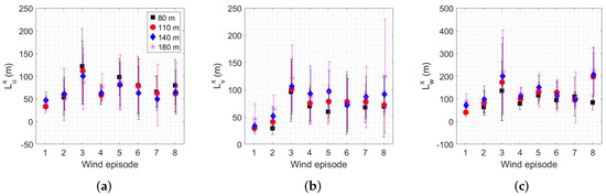 The turbulent length scales of three velocity components in the along-wind direction, , and , were calculated according to Equation (3), where the corresponding integrals of correlation functions were approximated using the trapezoidal rule. The mean values of along-wind turbulent length scales at four different heights are reported in Figure 13 for all wind episodes, while more details are given in Table A2 of Appendix B. At first, it can be noticed from Figure 13 that the values of along-wind length scales related to along-wind () and lateral velocity fluctuations () are comparable, whereas the values of the length-scale of vertical velocity () are significantly larger. Considering all Bora episodes in this study, we found that the length-scale of vertical velocity increases with height faster and reaches higher values (up to 180 m) than the other two along-wind length scales. For better readability, that observation is represented in Figure 14, where the mean values of along-wind length scales are reported for two central heights, 110 m and 140 m.