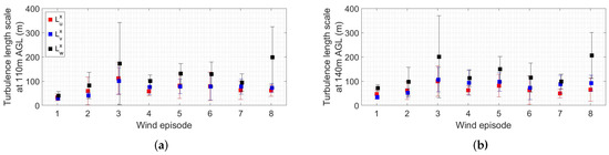 Mean values of along-wind turbulence length scales, obtained from Doppler wind lidar measurements at 110 m AGL (a) and 140 m AGL (b) for all eight wind episodes.