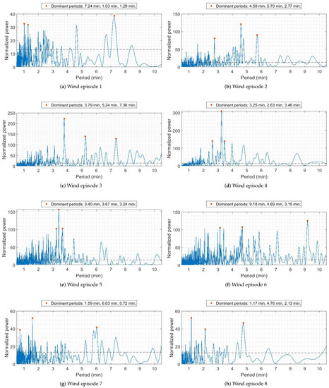 In this study, we assessed the periodicity of the flow by calculating the Lomb–Scargle periodograms of the vertical wind velocity component, obtained by DWL at the 110 m height AGL, thus representing the higher vertical range of atmosphere, which was not assessed up until now. Periodograms of the vertical wind speed are reported in Figure 16 for each Bora episode, along with the dominant period between 1 and 10 min. First, we observed that a number of periods appear in the periodogram of the vertical wind speed for all Bora episodes. Based on their power, we identified the three most significant ones for each wind episode (Figure 16). A periodicity of ≈3.5 min was detected during Bora episodes 3, 4 and 5. These episodes occurred during two consecutive days, which were characterized by two different prevailing Bora directions in the valley and thus by different orography. A slightly larger period of ≈4.5 min was detected both in Bora episode 2 and 6, while it also occurred during wind episode 1. Shorter dominant periods of up to 2 min were detected during wind episodes 7 and 8 (which occurred on the same day) and during wind episode 1. Finally, multiple periods with comparable power were detected during wind episode 6, of which, the dominant period of 9 min had the greatest power.