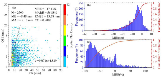 To validate the real-time QPE of the FY-4A AGRI provided by NSMC, Figure 2 presents the comparison between RG hourly precipitation and NSMC QPE of the FY-4A AGRI from June to August of 2020 in Western China. As shown in Figure 2a, all hourly QPEs are less than 30 mm, the ME is a negative value of −8.48 mm, and the scatter clustering trend of data is lower than the diagonal of 1:1 and far away, indicating that the NSMC QPE is obviously underestimated relative to the RG hourly precipitation. The CC between RGs and QPE is only 0.208, with values of 13.78 mm, 9.13 mm, −47.4%, and 56.9% for RMSE, MAE, MRE and MARE, respectively, indicating poor agreement and a large discrepancy between RGs and QPE. Although the ME has an average value of −8.48 mm, about 30% of the ME values are less than −10 mm (Figure 2b). The MRE ranges from −100% to 100% with an average value of −47.4%, and more than 65% of the MRE values are less than −50%. Apparently, the existing QPE of the FY-4A AGRI is underestimated and presents poor agreement with RG hourly precipitation greater than 5 mm over the complex topography of Western China; therefore, it is necessary to study the improvement of the QPE algorithm for the FY-4A AGRI.
