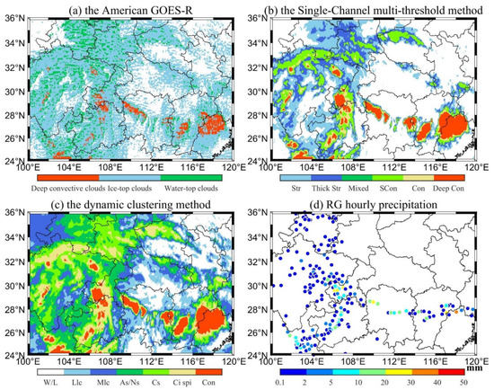 Cloud classification of (a) Method 1, (b) Method 2, and (c) Method 3 and (d) the hourly precipitation at 08:00 LST on July 1, 2020, in Western China. (Str: Stratiform clouds, Thick Str: Thick stratiform clouds, Mixed: Mixed clouds, SCon: Shallow convective clouds, Con: Convective clouds, Deep Con: Deep convective clouds, W/L: Water/Land surface, Llc: Low level clouds, Mlc: Middle level clouds, As/Ns: Altostratus/Nimbostratus clouds, Cs: Cirrostratus clouds, Ci spi: Cirrus spissatus clouds).