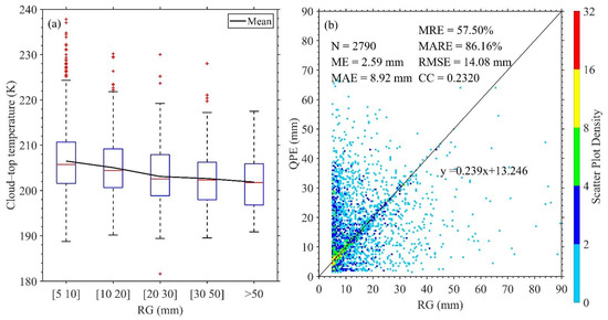 The plots of the RG hourly precipitation vs (a) the cloud-top temperature of LWIR channel 12 and (b) the primary FY-4A QPE from June to August of 2020 (In Figure 4a, bottom and top of boxes denote the 25th and 75th percentiles, with the horizontal lines inside the box being the median value; the dotted lines represent the range of the adjacent value, which is the most extreme value that is not an outlier; the outliers are marked by crosses).