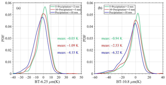 Considering the special scanning mode of the FY-4A, and the time matching with hourly precipitation, the hourly variation rate of TB, i.e., the TB difference between the current time and one hour before, is used to investigate the relationship between TB variability and hourly precipitation. In order to eliminate the influence of water or land surface and low level clouds, the TB of IR channel 12 of less than 270 K was used as the cloud criterion in this study (referring to this criterion, only 4 of the 364,477 ground surface temperature samples were lower than 270 K and might be misidentified as cloud), and the TB of the RG station is represented by the average of the TBs within 20 km around in one hour. Figure 5 presents the relationship between the hourly precipitation and the hourly variation rate of TB for WV channel 9 and LWIR channel 12; with the increase in hourly precipitation, the hourly variation rate of TB for WV channel 9 is negative and its magnitude increases, that is, the TB at the cloud top decreases with time and decreases faster with the increasing hourly precipitation. Similarly, this is the same situation—and the effect is more significant—for the hourly variation rate of TB for LWIR channel 12. However, the relationships of the hourly precipitation with the TBs of the other channels are not significant (figures not shown). Thus, the TBs of LWIR channel 12 were used to improve the CST algorithm for calculating the secondary QPE.