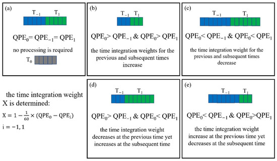 where QPE0 is the instantaneous QPE at the current time (T0) obtained from the CST algorithm, and QPE−1 and QPE1 are the instantaneous QPE at the previous (T−1) and subsequent (T1) times, respectively. The dynamic time integration method is shown in Figure 6—the number of bars represents QPE; the blue and green bar represents QPE−1 and QPE1, respectively, assuming that the five grey bars represent QPE0 and remain constant. The ideal state is that the three QPEs are equal and, in this case, no processing is required. In addition to the ideal state, the processing methods of the other four cases are as follows: (1) when QPE0 is greater than QPE−1 and QPE1, the time integration weights for the previous and subsequent times increase; (2) when QPE0 is smaller than QPE−1 and QPE1, the time integration weight for the previous and subsequent times decrease; (3) when QPE0 is greater than QPE−1 but smaller than QPE1, the time integration weight decreases at the previous time yet increases at the subsequent time; (4) when QPE0 is smaller than QPE−1 but greater than QPE1, the time integration weight increases at the previous time yet decreases at the subsequent time.