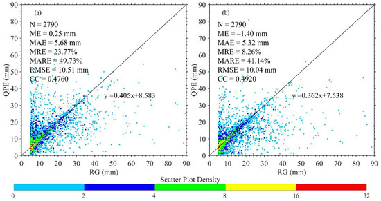 To match the RG hourly precipitation and QPE of the FY-4A AGRI, the principle of proximity and the method of taking the mean value were adopted as follows: first, to avoid the uncertainty of weak precipitation, only an RG hourly precipitation greater than 5 mm was used in this study (The CST algorithm gives stratiform cloud precipitation a fixed rainfall intensity, generally 2 or 2.5 mm/h). Because our research object was heavy precipitation, this threshold of 5 mm/h was to reduce the impact of weak precipitation); second, at a fixed RG station, all effective QPE data within one hour and 20 km away from the station were matched, but only the QPE with the closest value to the RG hourly precipitation was selected. Finally, there were 2790 matched couples selected from June to August of 2020.