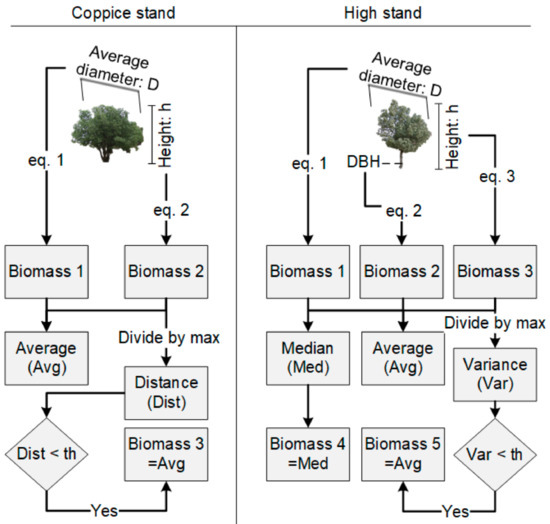 Here, obtaining different AGB values for a given tree was inherent, since each allometric equation in Table 1 features a different independent variable (H, D, and DBH). Therefore, we performed a numerical modification to derive an average instead of an average that possibly does not incorporate different possible values for AGB. We did this modification by first defining a threshold value and then checking the variance of different AGB values prior to calculating the final reference value. This ensured that the AGB value was ignored, i.e., it was treated as an outlier, if the variance (for high trees) or distance (for coppice trees) was higher than the defined threshold value. Otherwise, we calculated the mean value of the applied multiple AGB equations and considered it as the modified average. This resulted in the final four AGB values for high stands and three values for coppice stands. In addition, the median of the three AGB values of high stands was considered to be an additional AGB value (Figure 3).