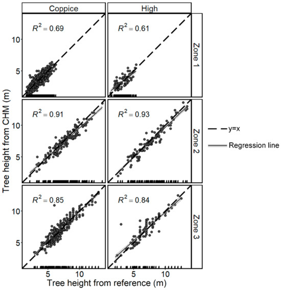 The results of tree height estimation for both vegetative forms were obtained in each zone (Figure 4). The reader is referred to the Appendix A for the site-specific results. The results suggested the R2 values of 0.69, 0.91, and 0.85 for high stands and 0.61, 0.93, and 0.84 for coppice stands for CHM-derived tree heights compared with the reference values in Zones 1–3, respectively. Apart from the practically accurate fits, it also suggested a high-quality segmentation that was previously carried out by MCWS prior to height estimation.