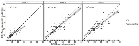 In terms of DBH, it is among the most conveniently-measured variables in the field. Its direct derivation from passive UAV imagery is infeasible, but it is possible to be estimated by models incorporating image-based UAV measurements, such as tree height and canopy area [99]. Here, we estimated H and A from UAV data across areas with high trees, which was in line with previous studies that estimated DBH using passive photogrammetry data [45]. Our linear model reached an R2 in range of [0.67, 0.91] for Zones 1, 2, and 3, which was comparatively in line with [100] that reported R2 of 0.738 in a nonlinear model of DBH as a function of canopy diameter and tree height.