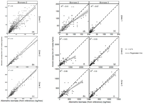 Biomass values obtained from allometric equations on variables measured by UAV (vertical axis) and reference values (horizontal axis) in coppice stands (a–c) and high stands (d–i).