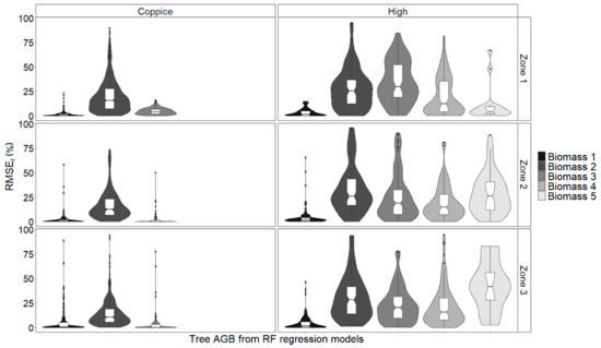 As expected, model 3 returned intermediate results for coppice trees, since it was averaged from models 1 and 2. This was also partially the case for high stands. Among models 2 and 3, i.e., models based on DBH and H, the model with allometry on height in high trees outperformed the model with DBH for Zones 2 and 3. This was indicated by the lower mean rRMSE and the higher density of error distribution in the lower values for model 3. The allometric model 4, i.e., the median of models 1, 2, and 3, showed higher accuracy than model 5 for Zones 2 and 3, as resulted by its comparatively lower average value and the higher density of error distribution in the mid-range. In all three zones, the DBH model for the high stands was shown to perform weaker than almost all other models (except for Zone 1). Furthermore, model 1, i.e., the allometry on D, performed better than all other models. For coppice stands in all three zones, D and H were the most and least influential variables in allometric models, respectively (the site-specific results are presented in Appendix D).