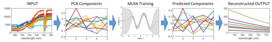 When applied to spectral data, the first step in PCA consists of projecting the output spectra onto the first principle components (PCs), , where p is the number of selected components, and B is the number of original bands of the spectra. This is performed by obtaining the eigenvectors and eigenvalues of the estimated covariance matrix of the spectral inputs . The eigenvectors matrix, , is then used as a projection matrix that allows us to obtain the so-called -scores, simply by . As is an orthogonal matrix the reconstruction of providing the scores is obtained by . Hence, the spectra is reconstructed. By sorting the PCs from highest to lowest representation, we can vary the number p and evaluate the performance for PC. In this way, considering only a small number of PCs (low p value) will lead to a poor representation of the feature space and consequently model performance will be low. By increasing the number of PCs reconstruction of the feature space will improve, and at the same time, model performance increases. The goal is to find the optimal number of PCs that allows us to reduce the dimensionality of the input data () while preserving the main spectral features. Thus, the MLRA first predicts the PCs, and afterwards the data are transformed back from the PCA domain (inverse PCA) to obtain the reconstructed output spectra at expenses of some loss in accuracy. Although this techniques requires iterative training, it is distinctly faster than train a MLRA with hyperspectral data without applying a DR. [5,8,12,16,23].