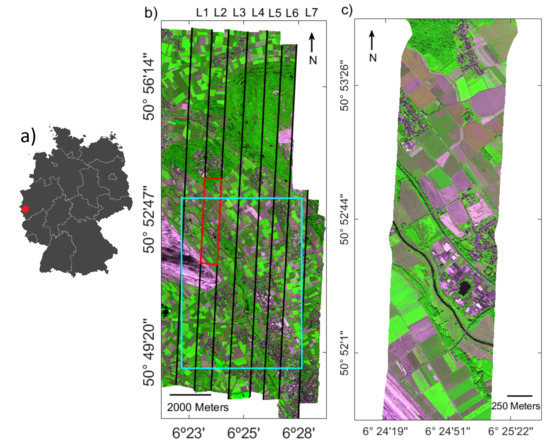 (a) Location of the study area in the western part of Germany. (b) RGB composite (700.1/754.4/674.4 nm) of the HyPlant FLUO mosaic consisting of seven flight lines (black framed areas) with the subset of flight line L2 used to build the emulator (red framed area). (c) Enlarged view of the subset of flight line L2.