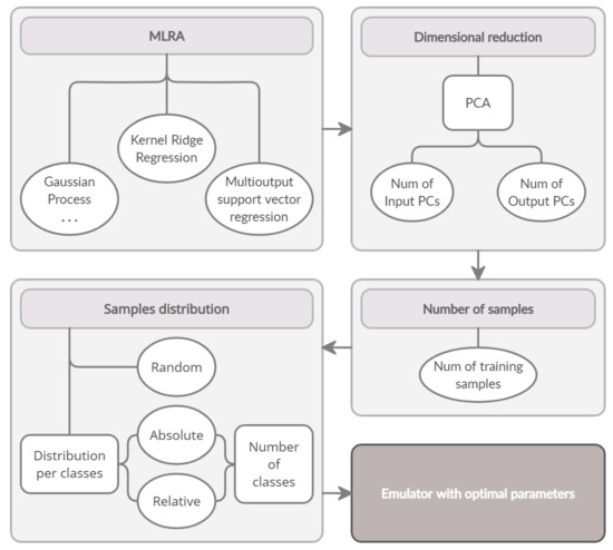 Emulation is a statistical learning technique used to approximate model simulations when the model under investigation is too computationally costly to be run many times [9]. Emulators are based on machine learning and use a dataset made up of input–output pairs for training. In this way, the emulator is able to infer the statistical relationships on which the original complex model is based and thus imitate the behavior of the original model with a much lower computational cost. These data pairs should ideally cover the maximum multidimensional input space. Once the emulator is built, it is not necessary to perform any additional training of the model [9].