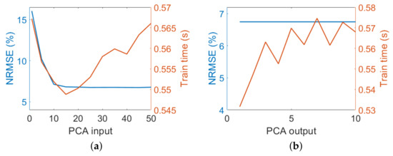 NRMSE (in %) (blue axis) and process time (orange axis) results for the KRR emulator performance assessment varying number of PCs in PCA input conversion (1000 samples, 5 PCA output) (b), and PCA output conversion (1000 samples, 20 PCA input) (a).