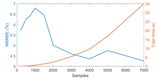 Third, the effect of the training database size on the emulator’s performance was analyzed. Using the previously identified optimal number of 20 PCs for the input and 5 PCs for the output data the performance of the KRR model was studied by randomly increasing the number of training samples (Figure 6). Increasing the training sample size had the greatest effect on model performance. The NRMSE decreased from 7 to approximately 4% and leveled off when 3000 or more training samples were used. Adding more training samples, however, is accompanied by an increased time for model calibration. Hence, we strive to reach a reasonable trade-off between the number of samples and the associated time required for model training. Since the model trained with 3000 samples was identified as the best compromise of sample size and processing time, it was chosen to train the final emulator.