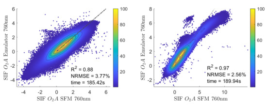 The SIF emulator was then applied to HyPlant FLUO image data of adjacent flight lines recorded close in time to the flight line L2 that the emulator was trained with. By doing this, it was possible to analyze the robustness and spatial transferability of the emulator. Figure 10 right shows the scatter plot of the SIF maps at 760 nm derived with the SFM and the emulated product. Overall, the SFM and corresponding emulated SIF values have a high level of agreement and show a good fit to the 1:1-line; however, the emulator slightly underestimates SIF values higher than 5 mW m sr nm. This underestimation is due to the fact that the model has been trained with pixel values collected from the subset of flight line L2, which only covered the data range between −5 and 6 mW m sr nm. Hence, it appeared that the emulator was not trained with very high SIF values and therefore the prediction of such values is uncertain. We can also observe a group of pixels for which the SFM provided values of around 4 mW m sr nm and the SIF emulator estimated values of around 7 mW m sr nm. When inspecting the origin of these data, it appeared to be the sludge of a sewage plant, i.e., a land cover type that was not included in the training data. Except for a few small areas, the emulator was able to accurately estimate SIF, which is indicated by the very high of 0.97 and the low NRMSE of 2.56%. These results underline the potential of the emulator to predict SIF from at-sensor radiance data of areas that were not included in model training.