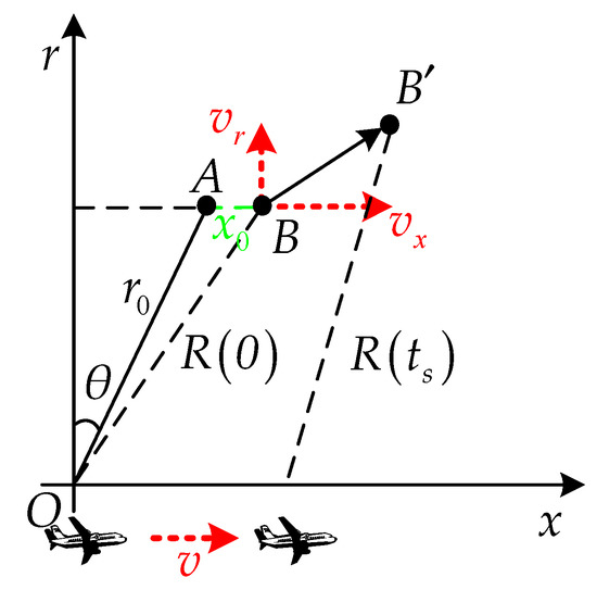 Consider the squint-looking SAR geometry as illustrated in Figure 1, where the x-axis is the azimuth direction and r-axis are the range direction. It is assumed that the SAR platform moves at the speed of v along the azimuth direction, the wave beam squint angle is . The range fast time and azimuth slow time are denoted as t and , respectively. The n-th pulse is transmitted at slow time , where T is the pulse repetition interval. When , the extended line of the wave beam center and the target line intersect at A, the distance between the SAR platform and A is . At B with the distance from A, there is a GMT whose azimuth and range velocity of GMT are and , respectively. Thus, the coordinate of the SAR platform and the GMT is and at , respectively. When the slow time is , the coordinate of SAR platform becomes and the GMT moves to .