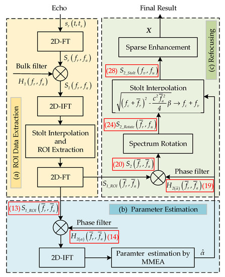 where and are range and azimuth frequencies of ROI data. Assume that the size of original data is , and the size of ROI data is , where , denote the range samples and , denote the azimuth samples. The ROI data usually occupy a small part of the original image, which means the volume of data is reduced. The next of the proposed method is on the basis of ROI data.