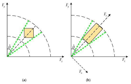 (a) Spectrum support region selection before the spectrum rotation; (b) Spectrum support region selection after the spectrum rotation.