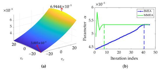 First step of MMEA is to obtain the initial parameter interval. In most of the practical situations, the GMT velocity is less than 30 m/s. As is shown in Figure 9a, according to and different velocity pair [, ], the initial parameter interval is easily obtained, that is [, ]. The parameter iteration comparison graph of MMEA and IMEA is shown in Figure 9b, from which we can see MMEA and IMEA reach the same estimated parameter . However, IMEA iterated over 40 times to reach the final parameter, while the proposed MMEA iterated less than 10 times. The reason why MMEA cost such a few iterations is that the parameter interval shrinks to the half range in every iteration and the optimal parameter is guaranteed within the parameter interval all the time. If the initial parameter is set properly, IMEA can also converges fast. The problem for IMEA is that it is difficult to set the proper parameter due to the unknown GMT motion. The MMEA does not need to set an initial parameter but a parameter value range which is irrelevant to the actual GMT motion.
