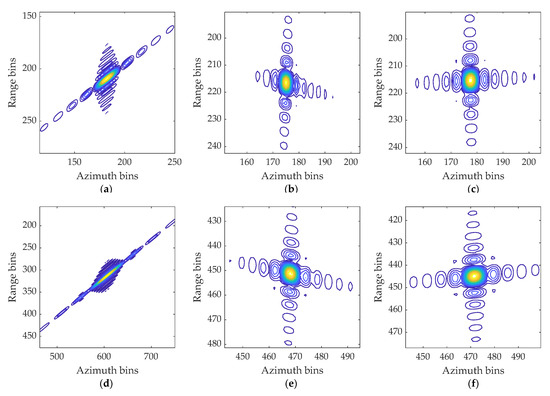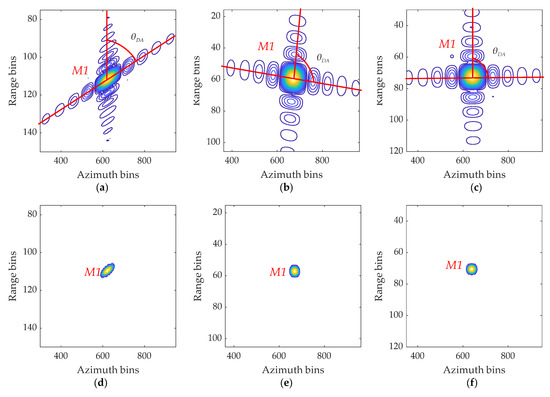 Moving target focused image and sparse enhancement image with or without spectrum rotation: (a) Focused image without spectrum rotation; (b) Focused image with SASR; (c) Focused image with ESASR; (d–f) Sparse enhancement image of (a–c), respectively.