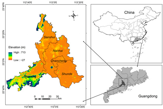 Foshan is spread across an area of approximately 3792.65 km2 in the south–central area of Guangdong Province, southern China (22°38′–23°34′ N, 112°22′–113°23′ E). The Xijiang River, Beijiang River, and tributaries of the Pearl River run through Foshan. The study area has a southern subtropical monsoon climate with an average annual temperature of approximately 24 °C and average annual precipitation of 1600–2000 mm [34]. Abundant hydrothermal conditions have contributed to a distinct “dike-pond” agriculture–aquaculture multiplex system to achieve renewable and sustainable development of ecological agriculture [35].