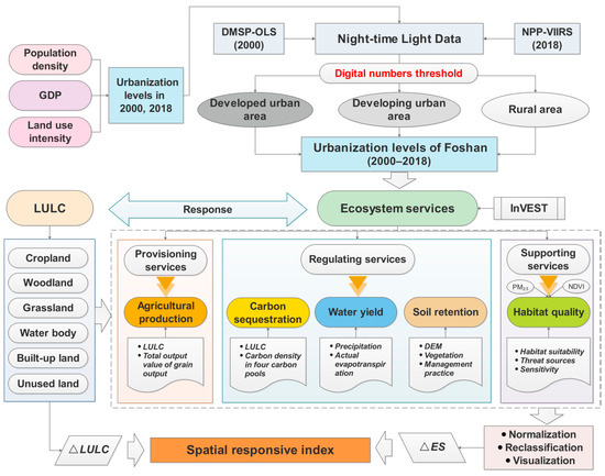 First, we constructed a series of consistent nighttime light datasets by integrating the Defense Meteorological Satellite Program’s Operational Line-scan System (DMSP-OLS) and the Suomi National Polar-orbiting Partnership Visible Infrared Imaging Radiometer Suite (NPP-VIIRS). The nighttime light data from 2000 and 2018 were used to classify the urbanization level of Foshan and to identify the rural, developing, and developed areas. Second, we used the InVEST and empirical models to assess the changes in agricultural production, carbon sequestration, water yield, soil retention, and habitat quality. We quantitatively evaluated the changes in LULC and ES from 2000 to 2018 and calculated the spatial response index under different urbanization levels. Finally, the various ES were normalized, reclassified, and overlaid to determine the total ES. The spatial distribution and zoning thresholds of the response of total ES to urbanization were mapped.