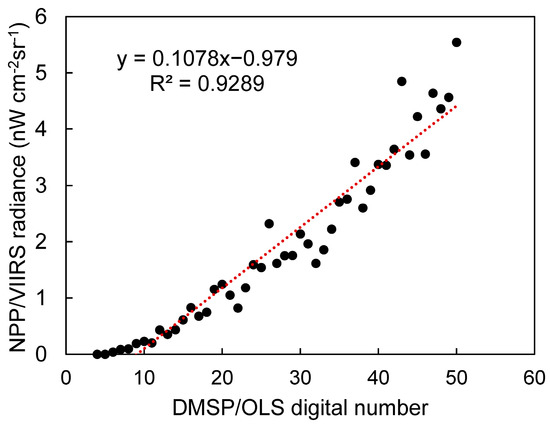 We used nighttime light data to quantify and classify the level of urbanization in Foshan. The DMSP-OLS light product in 2000 and NPP-VIIRS monthly product in 2018 were downloaded from the website of the Earth Observation Group. Owing to the differences between NPP-VIIRS and DMSP-OLS images, we constructed a series of consistent nighttime light datasets through integration and calibration. The inter-calibration method was referred to in the literature [39]. Nighttime light data from two sensors in the overlapping year of 2012 were used to construct the calibration function (Figure 3). The calibrated DN ranged from 0 to 63, with higher values representing higher levels of urbanization [40,41].