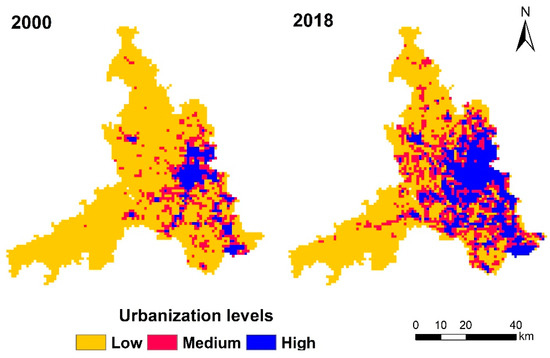 To establish the relationship between nighttime light data and the degree of urbanization development, we used the DN threshold to identify spatial regions under different levels of urbanization development over a period of time (2000–2018) [42]. Based on population density, land use intensity, and GDP, we constructed a comprehensive urban development index that characterized Foshan’s urbanization level. Land use intensity refers to the percentage of construction land area to the total area of the region, reflecting the intensity of human activities [43]. The greater the proportion of construction land area, the greater the intensity of human activities and the higher the level of urbanization. Population density can reflect the degree of population concentration in a city. The greater the population density, the higher the level of urbanization. GDP reflects the economic level of the region. The higher the GDP, the higher the level of urbanization. Due to the obvious differences in population density and GDP per area in some developed areas, the two indicators fluctuate greatly. Therefore, with the method of logarithm in statistics, the weakened volatility characteristics are substituted into the calculation to facilitate subsequent analysis. Based on the results of comprehensive urbanization indicators, the Jenks natural breakpoint method was used to divide the urbanization level into three levels: high, medium, and low, and the spatial distribution of Foshan’s urbanization levels in 2000 and 2018 were obtained (Figure 4). The formula for calculating the comprehensive level of urbanization is as follows: