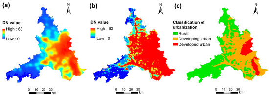 Classification of urbanization level based on digital numbers (DN) in Foshan from 2000 to 2018: (a) DN value in 2000, (b) calibrated DN value in 2018, and (c) classification of urbanization in Foshan.