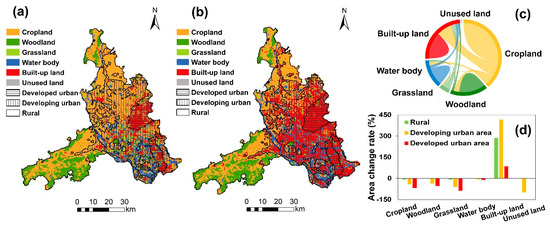 Land use and land cover change (LULC) in Foshan from 2000 to 2018. (a) LULC map in Foshan in 2000.(b) LULC map in Foshan in 2018. (c) The data of the chord diagram comes from the transfer matrix of land use from 2000 to 2018. The area of the strip represents how much one type of land is transferred to another. (d) The rate of change of the area of each LULC under different urbanization levels.