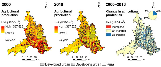 The changes in agricultural production services in Foshan from 2000 to 2018 are shown in Figure 7. The results show that the overall capacity of provisioning services dropped during this period. Areas with higher agricultural production were mainly distributed along the rivers and north-central rural areas. The gross output of agricultural production decreased by 1.20 million USD (based on the 2018 value of the USD) during this period (Table 4). The decline in agricultural production was mainly concentrated in developing urban areas, reduced by 963.1 × 103 USD. However, the area with the largest relative decrease in agricultural production was located in developed urban areas, a decrease of 77%. The developed urban and rural areas reduced by 136.7 × 103 and 103.0 × 103 USD, respectively.