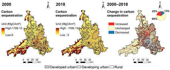 The changes in carbon sequestration in Foshan from 2000 to 2018 are shown in Figure 8. The changes in carbon sequestration were concentrated in developing urban areas. The areas of high carbon sequestration were mainly distributed in the southwestern area covered with woodland. Carbon sequestration increased by 84.7 × 103 MgC during 2000–2018 (Table 4). The rural areas had the highest carbon sequestration (17,850.6 × 103 MgC in 2000; 17,860.9 × 103 MgC in 2018). Regarding the overall rate of change in carbon sequestration, the developing and rural areas increased by 0.55% and 0.06%, respectively. In the developed area, the carbon sequestration decreased by 0.16%. The area where carbon sequestration had not changed accounted for 65% of the total area. The area with increased carbon sequestration was mainly in the developing and northern developed areas, accounting for 22% of the total area. The area with decreased sequestration was in the southern developed urban area, accounting for 13% of the total area.